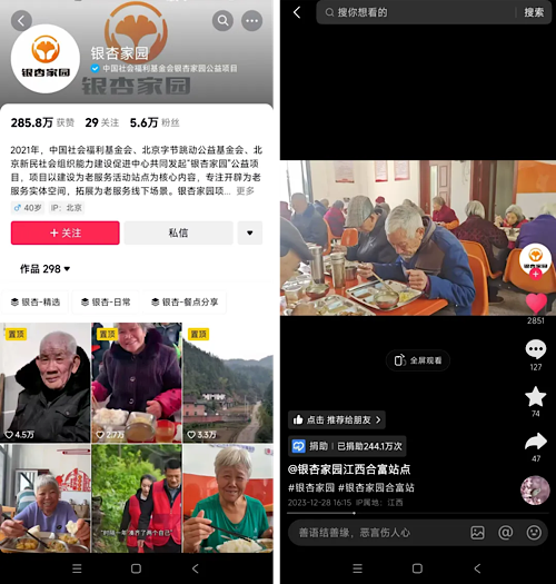 实际上,“银杏家园”所有站点在启动运营时都会要求执行机构注册抖音账号,定期发布站点老人生活视频,记录站点的助餐、防诈培训、医疗服务等活动,同时发布项目捐赠情况的进度。这些内容会获得字节跳动公益平台的流量扶持和推荐,以此倡导更多抖音用户关注助老需求,参与助老行动。近一年来,“银杏家园”站点抖音号共发布视频5208条,直播助餐3245场,累计筹款17.8万元。
