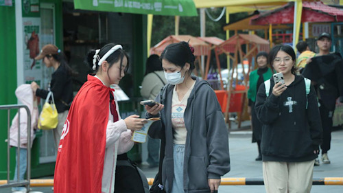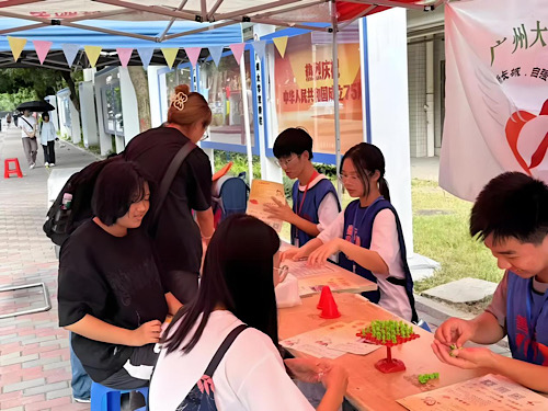 理论基础已打好,劝募实战很需要!大学生志愿者们早早地在校园集合,随即开始布置善行100活动摊位。摊位上摆满了宣传物料、益智玩具,他们脸上洋溢着灿烂的笑容,或坐在桌前静待好奇心青年,或分散校园各处跟来往同学介绍善行100活动,并邀请他们加入善行100队伍,助力美育之花在乡村绽放。