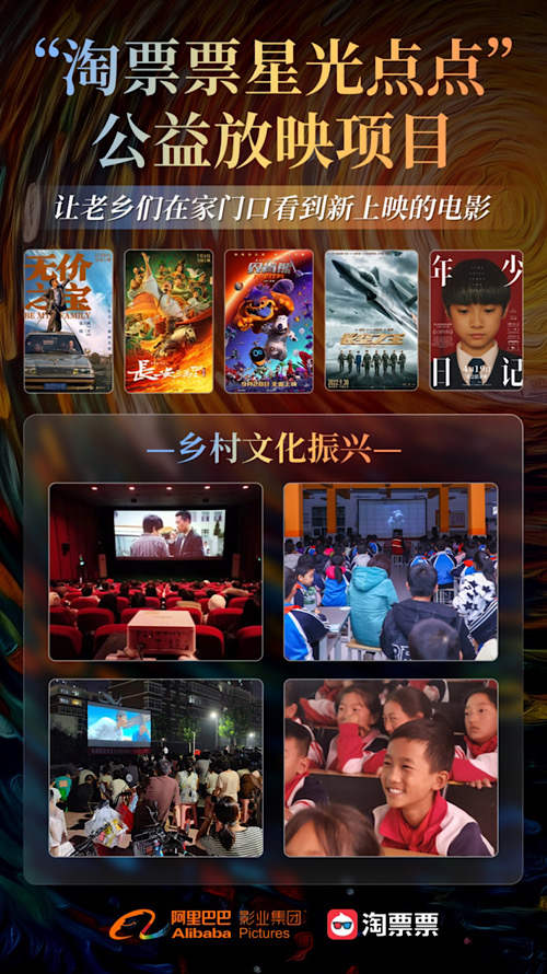 “淘票票星光点点”由阿里影业联合阿里巴巴公益共同发起。项目聚焦乡村电影公益服务,致力于通过新上映优质影片在乡村的同步放映,助力乡村文化振兴。2022年7月推出至今,“淘票票星光点点”已走进24个省/市/自治区,将《外太空的莫扎特》《独行月球》《长空之王》《长安三万里》《超级飞侠:乐迪加速》《贝肯熊:火星任务》《无价之宝》《银河写手》《年少日记》《走走停停》《落凡尘》《逆行人生》《蛋宝大营救》等13部影片送到老乡家门口,累计放映超2100场。