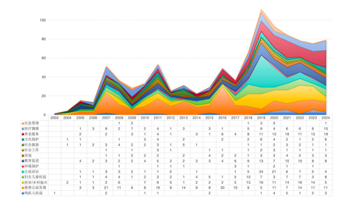 第一,2003 -2024年间的慈善类建言数量呈现整体上升趋势,曾出现4次周期性高峰。2007年、2011年、2016年和2019年出现周期性高峰,周期性高峰的出现与相关政策和热点事件高度相关。在周期性变动的基础上,慈善类建言在近5年出现跨越式增长,2019年达到22年的最高峰。