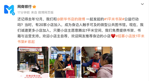 “你腾出1平米空间,我们支持书架和书籍!”4月3日,由网商银行和新华书店总店联合发起的“1平米书架”公益行动面向全国小店发起招募。