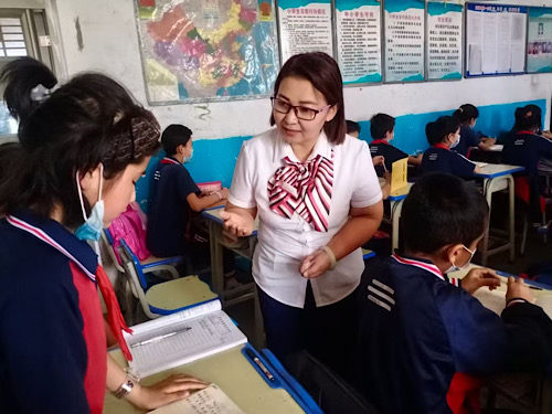 伽师县巴仁镇第四小学语文教师努尔孜巴·要力达西为二年级学生授课