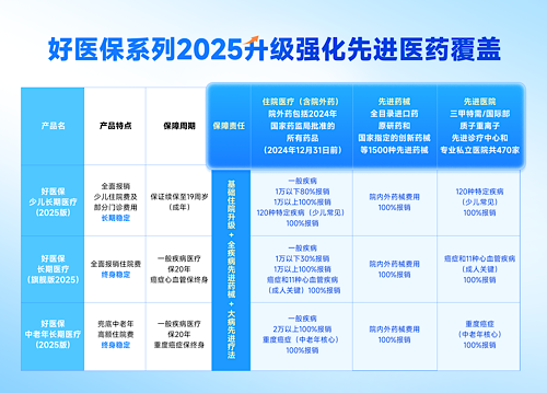 据了解,此次升级涵盖“好医保”三款核心产品,分别是:由人保健康承保的好医保·长期医疗(旗舰版2025)和好医保·中老年长期医疗(2025版),以及平安健康保险承保的好医保·少儿长期医疗(2025版),覆盖了成人、中老年、少儿全年龄段人群,能够一站式满足全家人对高品质先进医药的健康保障需求。