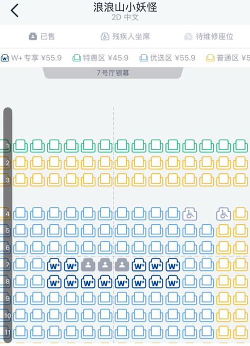 万达电影APP购票界面的“残疾人坐席”标识
