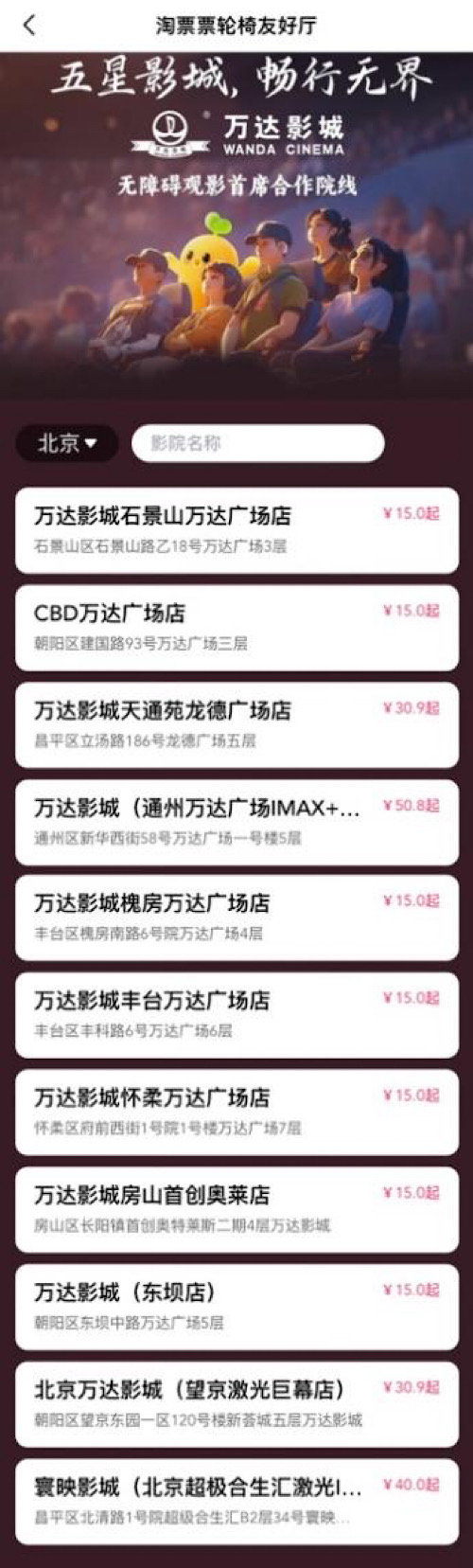 据了解,万达影城在此次公益合作中充分响应了《无障碍环境建设法》的号召,进一步加强了影厅的无障碍建设和改造,包括拓宽通道、优化座位布局、增加无障碍标识等,旨在让轮椅用户能够顺畅通行并享受“平视观影”的最佳体验。截至目前,拥有“轮椅友好厅”标识认证的万达影城影厅共有308个,覆盖全国78个城市的170家万达影城,影厅将为轮椅用户提供从线上选座到线下观影的全流程无障碍服务。在淘票票“轮椅友好厅”界面还设有“五星影城,畅行无界”万达影城专题页,方便影迷根据城市选择适合的影厅座位,真正实现"线上选座,线下畅行"的无障碍观影体验。