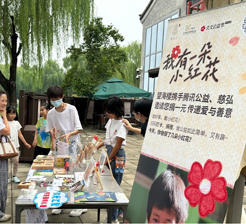 北京慈弘慈善基金会在后海望海楼举办“小红花公益市集”,通过义卖来支持乡村学校图书角建设,受到市民和游客们的欢迎。