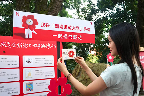在湖南师范大学,大学生们参与久久公益节,将适合儿童阅读的图书捐赠到乡村学校。