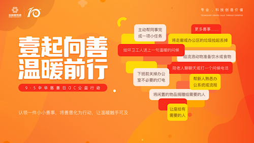 为响应“中华慈善日”,金融壹账通发起“壹起向善 温暖前行”公益行动,号召全体员工从身边小事做起,传递温暖与善意。递上一杯热水、关掉不必要的灯电、向环卫工人送上一句问候,或为流浪动物准备一碗清水——这些看似微小的善举汇聚成温暖洪流,点亮社会的每个角落。