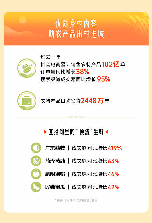农业农村部农村经济研究中心报告指出,兴趣电商“帮助特色农产品用市场化方式缓解淡旺季销售波动压力,减少积压和压价情况”,切实保障了农民收益。过去一年,抖音电商全年售出农特产品102亿单,日均发出产地包裹2448万个,农特产订单量同比增长38%,搜索渠道成交额增95%。