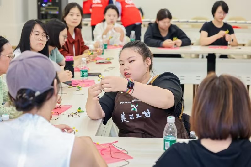 融合工坊环节成为活动一大亮点。工坊内,手工文创体验与“汇爱订单”跨障碍团队协作活动同步开展。值得一提的是,全部手工指导老师都由残障人士担任,她们在手工文创体验中展现出精湛技艺,耐心指导健全人制作杭州亚残运会的金枝折桂手工胸针。从材料选择到制作工艺,老师们一步步细致讲解,学员们认真学习、积极参与。通过这种互动,不仅让健全人体验到手工制作的乐趣,更重要的是为残障人士提供了展示技能的平台。而“汇爱订单”跨障碍团队协作则将活动推向高潮,残障人士与健全人组成团队,共同完成订单任务。在这个过程中,大家相互配合、发挥各自优势,打破障碍,携手共进,深刻诠释了残健融合的理念。这不仅增加了残疾人的收入,更提升了他们的社会认同感与自信心。