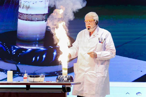 在随后的“化学魔法”课堂上,中国工合国际委员会副主席、北京化工大学科普实验中心主任、中国政府“友谊奖”获得者、英国籍化学专家戴伟教授针对高中生和小学、初中年龄段学生的不同特点,分别以“什么是化学反应”、“化学无处不在”为题,为同学们带来了生动、奇妙的化学课程。讲座开场,戴伟教授便以“点水成火”的神奇实验吸引了全场目光。