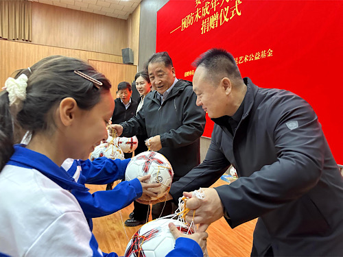 与会嘉宾以体育为纽带,为学生捐赠了一批足球,为喀什市校园足球事业发展注入新活力。为感谢公益机构的暖心之举,喀什地区教育局现场向中国文学艺术基金会姜昆艺术公益基金、北京华彬文化基金会回赠锦旗表达谢意。