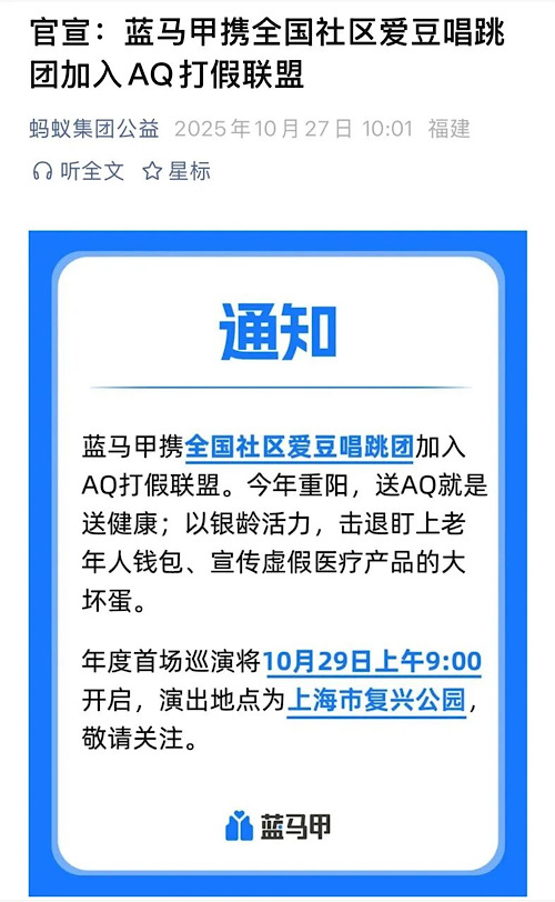 在蓝马甲乐龄健康嘉年华现场,“蓝马甲行动”负责人宣布,将启动助医志愿者招募,联合AQ扎根社区,打假虚假医疗广告。“通过开发系列宣讲课程、开展义诊、互动市集等活动,用伸手可触碰的温暖陪伴、随时可问询的专业医疗AI,蓝马甲希望为老人打造可信赖、有温度的社区氛围。”