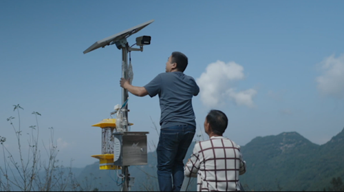 农场负责人蔡青松和村民一起调整海康威视的设备