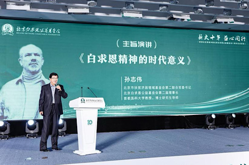 北京市扶贫济困领域基金会第二联合党委书记、北京白求恩公益基金会第二届理事长孙志伟教授在《白求恩精神的时代意义》主旨演讲中,从“为什么要学习白求恩”“白求恩精神的内涵”以及“白求恩精神的时代意义”三个层面,系统阐释了白求恩精神的文化内涵与当代价值,并指出公益的“利他性”与白求恩“毫不利己,专门利人”的精神内核高度契合。他强调,白求恩精神是先进文化和精神高地,具有跨越时空、行业、民族及意识形态的永恒魅力,是中华民族之魂的组成部分,应在新时代继续发扬光大,为民族复兴贡献力量。