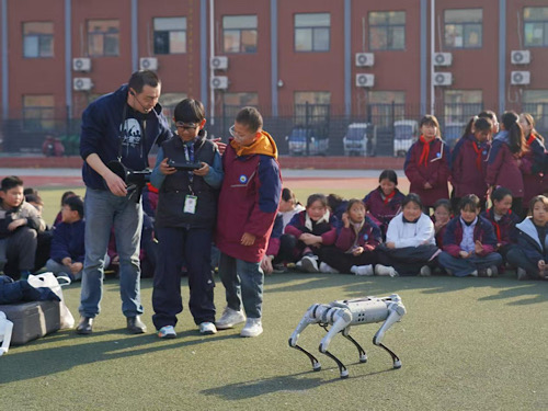 人工智能与动手实践类项目同样备受青睐。萌“汪”进校园活动中,专业操控的机器狗表演行走、跳跃、翻滚等动作,让学生们近距离感受人工智能的魅力。