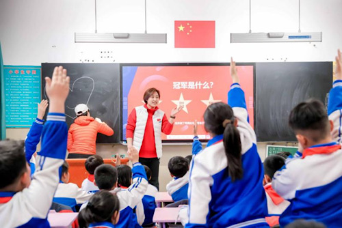 在“冠军大讲堂”的课堂上,运动员们与学生们面对面交流,分享个人成长经历与为国争光的奋斗故事,以真实感人的事迹传递坚持不懈、勇于追梦的正能量,在学生心中树立了生动榜样。一名小学生在互动后感动地说:“原来冠军也会怕累、会哭鼻子,但坚持下来就成了英雄。”