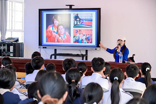 “冠军大讲堂”上,运动员们分享了自己拼搏路上的真实故事。他们讲述了如何通过体育找到方向、突破自我、成就更好的自己,用坚持与勇气向孩子们传递了追逐梦想的力量。这些生动的讲述,悄然在孩子们心中播下了信念与希望的种子。课后,不少学生主动写下感言,表达对他们的敬佩与感谢。一位学生写道:“谢谢您让我明白,跌倒也是成长的一部分。”另一位则表示:“我要像您一样,把每一次挑战都变成前行的力量。”