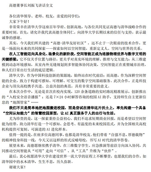 “今天我们助力清华打造的‘友好社区’,不仅是一次简单的地图应用落地,更是尝试在清华这片沃土上,率先构建一个具备空间认知能力的智慧校园原型。我们希望让AI真正服务于每个人的出行与生活。”高德董事长刘振飞表示。