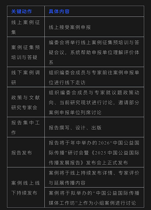 《2025中国公益国际传播发展报告》编委会现面向全社会各类企业、社会组织、事业单位征集“2025中国公益国际传播案例”,优秀案例将在报告中收录,并于2026“中国公益国际传播”系列活动上发布,欢迎积极申报。