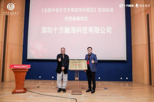 “参与标准制定是企业践行社会责任的重要举措,我们要让更多中老年人享受到高品质、规范化的文化服务。”王德祥道出了梨花教育的公益初心。在发布会现场,中华文化促进会向十方融海授予“团体标准参编单位”牌匾,为梨花教育教研团队及个人颁发证书,表彰其在标准研制中的突出贡献。