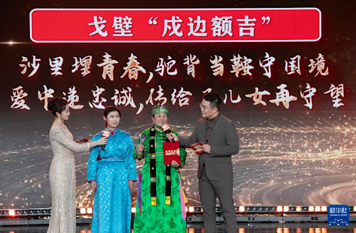 1月28日,由新华社主办的“中国网事·感动2025”公益盛典暨年度颁奖典礼在北京举行,活动揭晓“中国网事·感动2025”十大年度网络人物。这是“戈壁‘戍边额吉’”敖云其木格(右二)出席颁奖典礼。新华社记者 李安 摄
