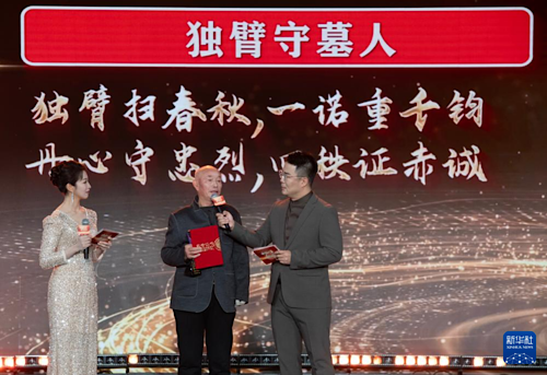 1月28日,由新华社主办的“中国网事·感动2025”公益盛典暨年度颁奖典礼在北京举行,活动揭晓“中国网事·感动2025”十大年度网络人物。这是“独臂守墓人”蔡恩坤(中)出席颁奖典礼。新华社记者 李安 摄
