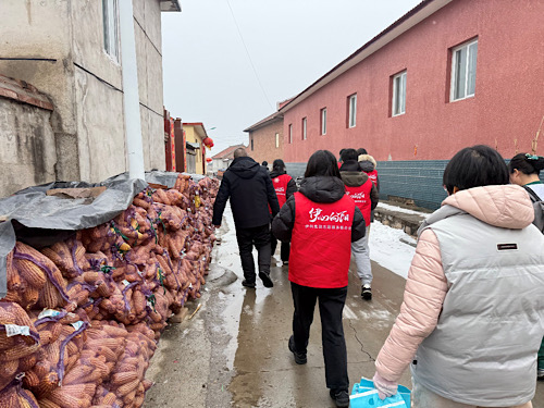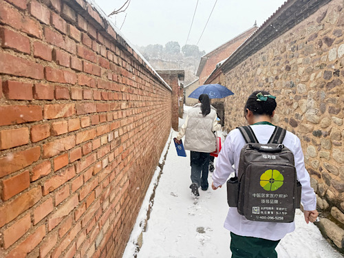 此次回访不仅是物资的送达,更是一次照护知识的传递。志愿团队由企业志愿者、福寿康集团的护理员以及本地志愿者和医护人员共同组成。尽管天降大雪、道路湿滑,“注意安全”成为途中最高频的叮嘱,但志愿者们仍分成小组,冒雪入户。志愿者们不仅搬运物资,还与老人促膝长谈,进行心灵陪伴。