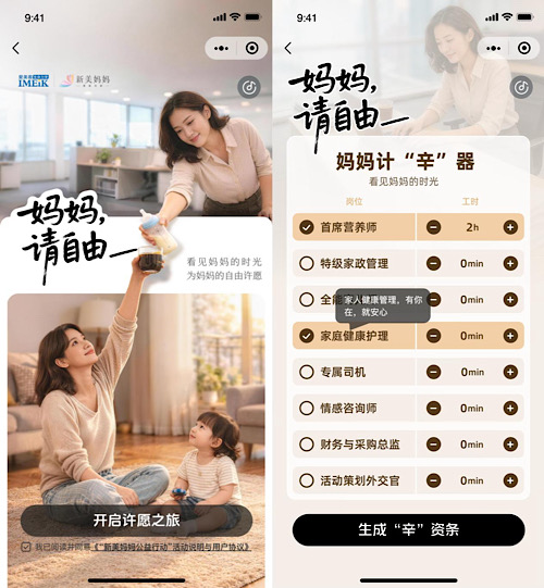 “用妈妈计‘辛’器算了一下,一位全职妈妈每天要承担‘8 个岗位’的工作,一天工时 9.5小时,一年接近3600个小时,相当于进行了400多次户外徒步,耐力足以贯穿中国最壮阔的风景线!”一位用户在试用了“妈妈,请自由 ”H5互动后如是感慨。