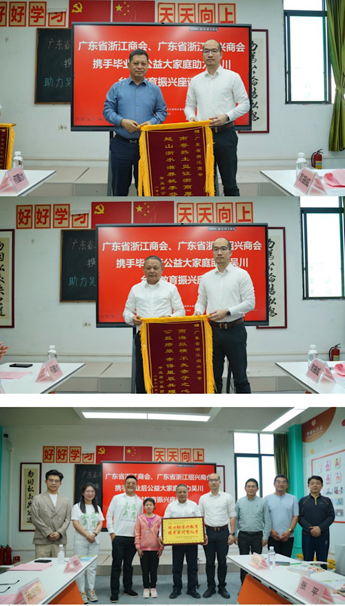 座谈会上,广东省浙江商会会长吴松喜、广东省浙江绍兴商会会长谢永灿、毕业后公益创始人刘楠鑫分别做了精彩现场感召,希望各位爱心企业家能够在力所能及范围内贡献力量,身体力行参与到山区现场活动。会议期间还同步完成荣誉证书颁发、公益倡议发布、领导致辞、荣誉锦旗颁发、牌匾敬赠等环节,既对各方公益付出予以肯定,也进一步凝聚起社会力量,为推动吴川乡村教育高质量发展奠定夯实基础。