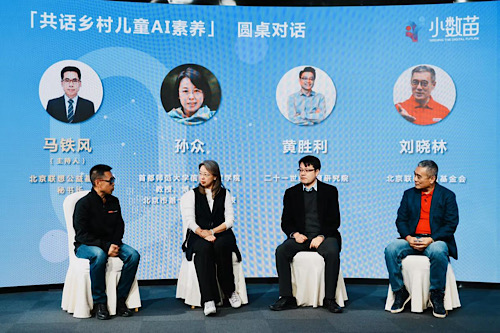 随后的圆桌对话环节,由北京联想公益基金会秘书长马铁风主持,首都师范大学信息工程学院教授博士生导师孙众、二十一世纪教育研究院执行院长黄胜利、北京联想公益基金会理事长刘晓林围绕“乡村儿童AI素养”展开深入交流。