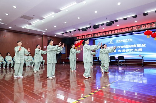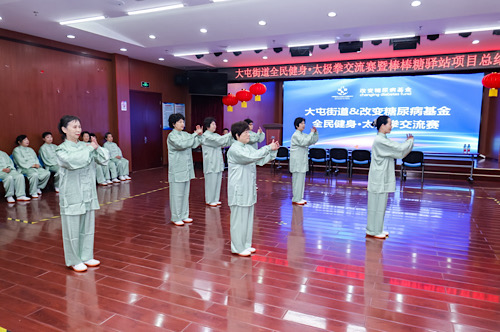 3 月 27 日,由大屯街道与中国医药卫生事业发展基金会改变糖尿病基金联合主办的“大屯街道全民健身·太极拳交流赛暨社区棒棒糖驿站项目总结会”在大屯街道市民活动中心举行。来自辖区的 7 支社区棒棒糖运动队同场交流,践行科学运动理念,以刚柔并济的太极拳法展现健康自信的糖友风貌。
