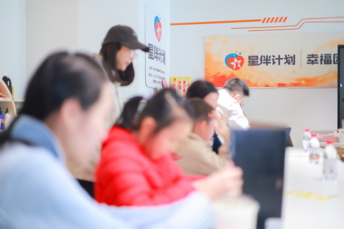 幸福团陪伴活动展集中展示了融合陪伴活动中星星孩子们的作品与成长印记,现场更复原穿线师星青年的现场操作工坊,让大家直观感受星青年的努力与风采;AI绘本展则呈现了星星剧场的真实故事,以及追星星的AI链接游戏课程共创的主题绘本,用科技与温情结合的方式,诉说星星孩子们的世界。现场的星周边、星星卡义卖环节,让每一份善意都有落脚之处。
