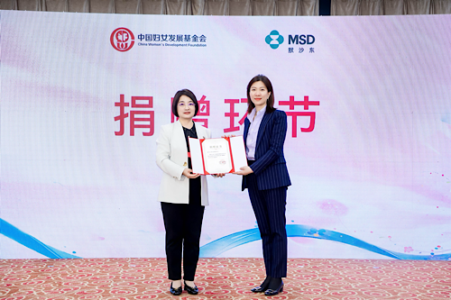 仪式现场,默沙东向妇基会捐赠善款217.95万元,用于支持“加速消除宫颈癌试点项目”,董葵代表妇基会为默沙东颁发了捐赠证书。