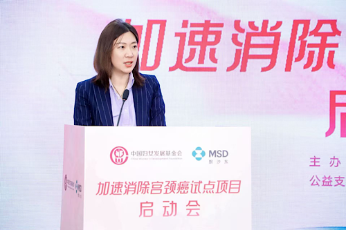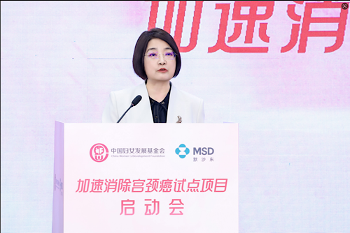 为助力《加速消除宫颈癌行动计划(2023—2030 年)》目标落地见效,切实推进低卫生资源地区妇女“宫颈癌”综合防治工作,4月23日,由中国妇女发展基金会(以下简称“妇基会”)主办,默沙东(中国)投资有限公司(以下简称“默沙东”)公益支持的“加速消除宫颈癌试点项目”在京正式启动。中国妇女发展基金会副理事长兼秘书长董葵、默沙东中国政府事务与市场准入部负责人王晓晔出席活动并讲话,中国妇女发展基金会助理秘书长李彩云主持活动。项目得到了试点地区陕西和甘肃两省妇联大力支持,部分社区女性和家庭代表出席活动。