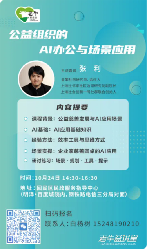 10月20日,老牛基金会微信发布消息,第32期老牛益讲堂将于10月24日下午在呼和浩特市回民区民政指导中心(一楼会议室)举办,主题聚焦“公益组织的AI办公与场景应用——效率工具·思维方式·现实场景”。本次活动由内蒙古老牛慈善基金会发起,多家公益机构联合主办。特邀业擎社创研究员、合伙人,上海社邻家社区治理研究院副院长,上海社会创新一号社群联合创始人张利主讲。