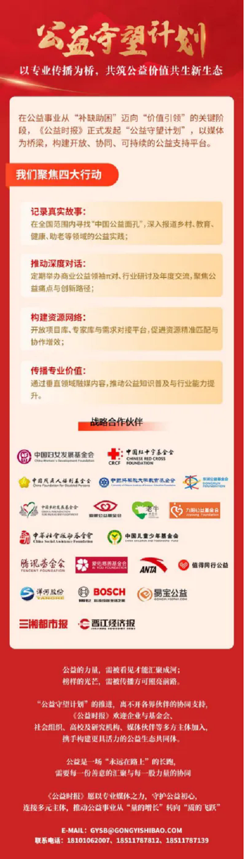 在此背景下,《公益时报》正式启动“公益守望·基金会高质量发展共建计划”。该计划致力于为基金会提供精准、专业的能力建设支持,聚焦内部治理、资源整合、信息公开、品牌塑造等关键环节,陪伴基金会一起成长,全方位提升综合能力。
