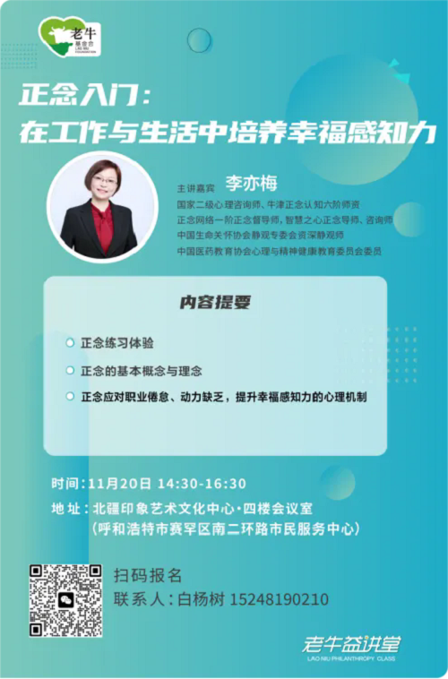 11月20日(周三)下午,第33期老牛益讲堂将在呼和浩特市北疆印象艺术文化中心(四楼会议室)举办,主题为“正念入门:在工作与生活中培养幸福感知力”。