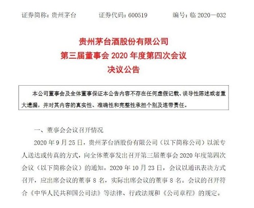 2020年10月23日,贵州茅台第三届董事会2020年度第四次会议决议公告显示,除审议《2020年第三季度报告》外,董事会还通过了五项决议,包括金额高达8.3亿元的捐款。