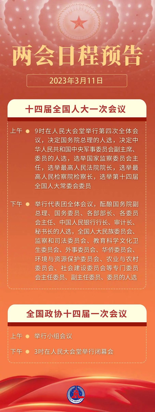 3月11日,人代会继续选举和决定任命国家机构组成人员,全国政协十四届一次会议举行闭幕会。