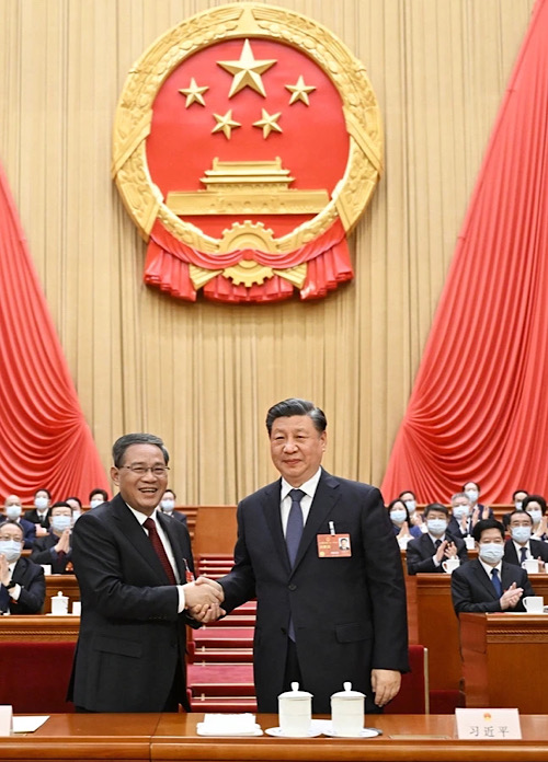 3月11日,十四届全国人大一次会议在北京人民大会堂举行第四次全体会议,根据国家主席习近平的提名,经过投票表决,决定李强为中华人民共和国国务院总理。这是习近平同李强握手。新华社记者 李学仁 摄