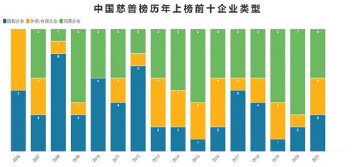 近二十年来,民营企业及民营企业家是大额捐赠当仁不让的主力。从2009年之前的占据半壁江山,到2009年之后的超过六成比例,至2018年以来达到近八成,民企在数量上已是中国慈善榜的主流。不过,若仅观察慈善企业榜单的前十位,国有企业的比例尚可,某些年份还可以占到大部分席位。这表明,国有企业作为国民经济的主要支柱,在公益慈善事业上的潜力也不容小觑。