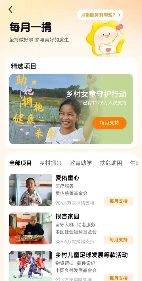 月捐,已成为越来越多机构和平台的共同选择。以字节跳动公益平台为例,自去年上线月捐功能至今年3月初,该平台上累计开通月捐功能的公益项目约132个,其中在筹项目103个,累计有超过14万用户开通月捐,为公益项目带来了1800万元捐赠。