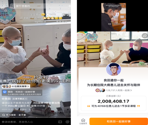 这次探访,良田先后创作并发布的两条公益视频,累计获得470万点赞,为长期住院大病患儿带来了200万元捐款。在捐款的人之中,有不少是良田曾拍摄过的受助者。良田坦言,社会上有很多这样的孩子,而自己能做的事情,就是跟这些孩子相处一天,拍下视频,把视频发出去让他们知道,这个社会有很多好人。“同时,我也希望呼吁大家关心他们,包容他们,让他们看到社会上更多的正能量,从而拥有一个幸福快乐的童年。”