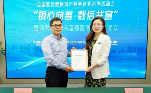 “杭工信•海亮数智共富慈善信托”在杭州签约。图片来源:数智未来研究院例如,由杭州工商信托股份有限公司、杭州数据交易所与浙江海亮股份有限公司共同发起的“杭工信•海亮数智共富慈善信托”于9月5日正式签约,标志着全国首单以数据收益权作为信托财产的慈善信托项目正式落地。