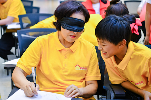 在由“爱暖万家”项目支持的亲子沟通能力提升体验营上,项目受益家庭的家长与孩子在“爱心妈妈”专业志愿者的引导下互动(受访者供图)
