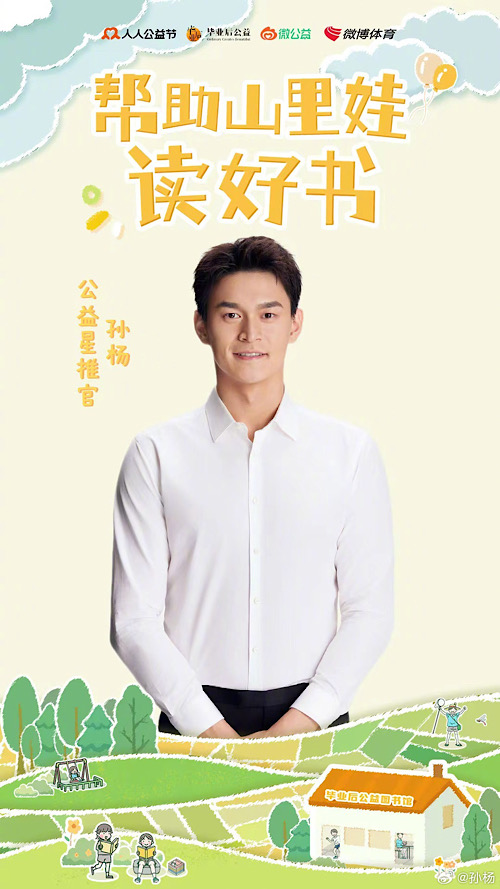 日前,孙杨参加了一个名为“守护乡村孩子的体育梦”的公益项目,希望有更多的社会力量关注乡村孩子的体育教育和体育梦想。此外,9月5日,孙杨在微博上宣布,加入由毕业后公益基金发起的一起捐活动,支持“毕业后公益图书馆”项目。