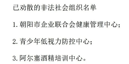 根据省、市相关工作部署,辽宁省朝阳市双塔区民政局深入推进打击整治非法社会组织专项行动,依法查处并劝散了一批非法社会组织,包括朝阳市企业联合会健康管理中心、青少年低视力防控中心、阿尔塞酒精培训中心。