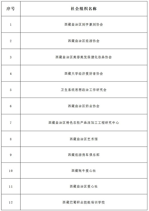 例如,西藏自治区刻字篆刻协会、西藏牦牛爱心社、西藏自治区爱心社等12家社会组织,因连续两年未按规定和时限向登记机关报送年度报告,依据《社会团体登记管理条例》《民办非企业单位登记管理暂行条例》等相关法规,相关部门依法对其给予撤销登记的行政处罚。同时,自公告之日起,以上社会组织不得以社会组织名义开展活动,社会组织法人登记证书正(副)本和印章自公告之日起作废。名单如下: