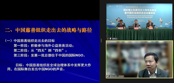 清华大学公共管理学院副院长邓国胜教授就《中国慈善组织走出去战略与路径》发表主旨演讲。他指出,中国慈善组织需加强学习、不断提升自身能力,从而在国际舞台发出中国社会组织的声音,发挥在全球治理体系中的独特作用。同时他也总结多年的研究成果,为社会组织提出了6个战略重点和4条走出去路径,为已经走出去及正在打算走出去的社会组织提供了参考。